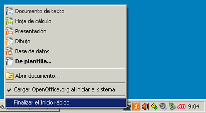 La primera vez que has arrancado una aplicación de la suite has tenido que hacerlo desde el grupo de programas que se había creado en el menú Inicio, pero en ese momento se ha incorporado también un icono en la barra de inicio rápido. En el futuro será la forma más rápida de crear nuevos documentos con OpenOffice.org, pero por el momento tendrás que cerrarlo pulsando sobre el icono con el botón derecho y eligiendo la opción de Finalizar Inicio Rápido.