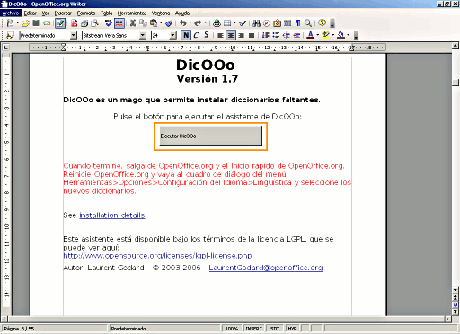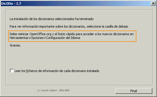 Tras elegir el idioma del que queremos instalar los diccionarios aparecerá un botón activo para ejecutar la macro DiccOOo. Verás que bajo el botón hay un aviso en rojo indicándote lo que tienes que hacer cuando finalice el proceso. De todas maneras, por si lo olvidas aparecerá un recordatorio similar cuando finalice la instalación de los diccionarios.