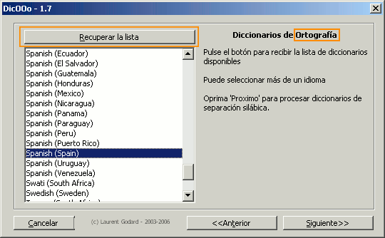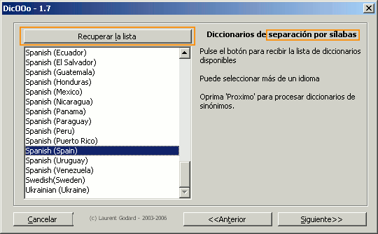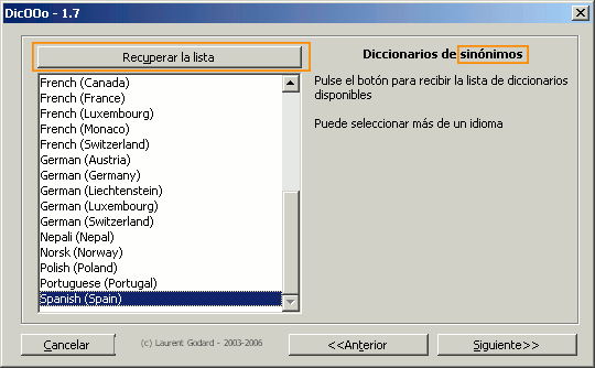Pasamos pues al proceso de descarga. En los tres casos: ortografía, separación silábica y sinónimos tendrás que pulsar primero en el botón para recuperar la lista de los disponibles y luego realizar la selección del que quieres incorporar.