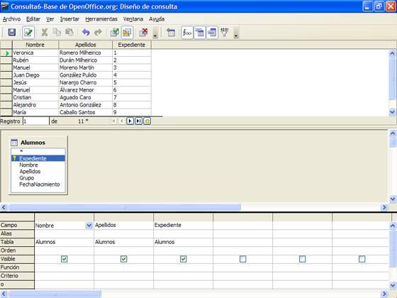 - Debes repetir el paso anterior para incluir tantos campos como necesites. Por ejemplo, en la figura 4.06 hemos diseñado una consulta para mostrar el nombre de todos los alumnos junto con su número de expediente.