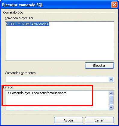 En esta ventana encuentras en primer lugar el cuadro denominado Comando a ejecutar. Será aquí donde debas escribir la sentencia SQL que deseas aplicar sobre la base de datos. Bajo este espacio se encuentra el botón Ejecutar que tendrás que utilizar para llevar a cabo las operaciones indicadas en el comando SQL.