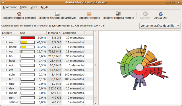 Si necesita un análisis más pormenorizado que incluya el espacio que ocupa cada carpeta vaya al menú Aplicaciones → Accesorios → Analizador de uso de disco. Una vez allí pulse Explorar sistema de archivos. Si quiere comprobar una carpeta en concreto haga clic en el botón Explorar carpeta y haga su selección.
