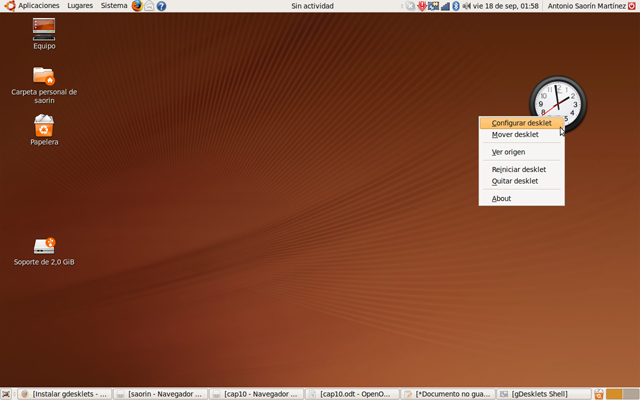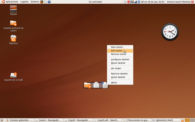 De este modo se trabaja con gDesklet. Pero si lo dejamos todo así la próxima vez que iniciemos el equipo todo habrá desaparecido del escritorio. Para que vuelva a verse será necesario ejecutar la aplicación desde el menú Aplicaciones → Accesorios → gDesklets. Si quiere que gDesklet se inicie junto con el escritorio haga esto: