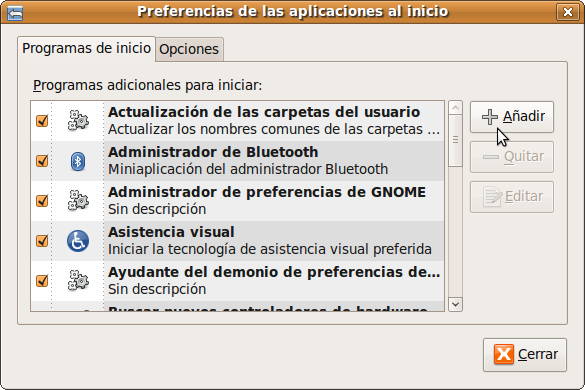 5. Busque ahora la entrada gDesklet en la lista y asegúrese de que la casilla que hay a su izquierda está marcada. Finalmente pulse Cerrar. Si quiere evitar que gDesklets se ejecute al inicio simplemente desmarque esta casilla.