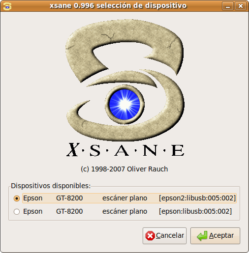 Al iniciar, Xsane realizará una comprobación de los dispositivos de captura conectados a su sistema y le pedirá, en su caso, que elija el origen de la imagen. A continuación, mostrará las diferentes ventanas que controlan el proceso de captura.