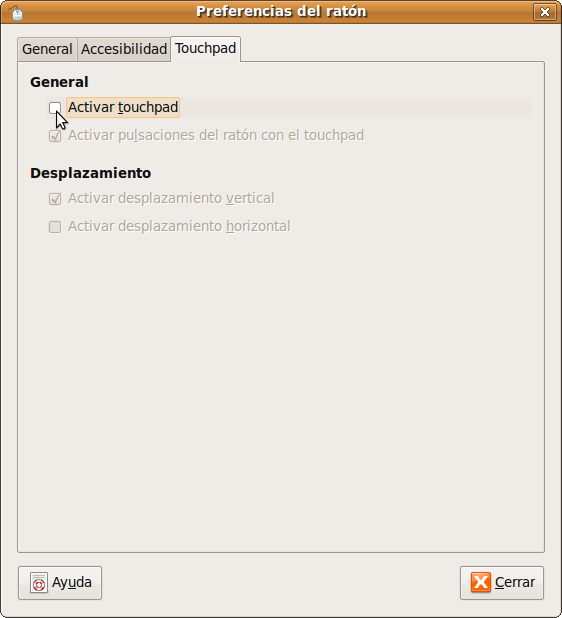 Los ordenadores portátiles viene con una especie de ratón integrado, conocido como Touchpad. Podemos controlar su comportamiento, vaya al menú Sistema → Preferencias → Ratón y haga clic en la pestaña Touchpad. Muchos usuarios encuentran cómodo poder desactivarlo cuando van a escribir texto masivamente, porque suele ocurrir que sin querer se toque y por tanto el cursor se desplace entorpeciendo con ello el trabajo. Para desactivar el touchpad desmarque la casilla Activar Touchpad.