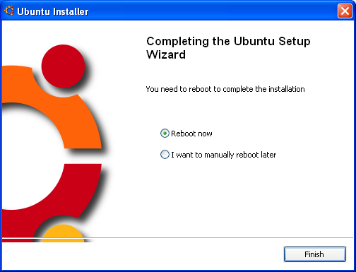 Cuando termine el proceso verá una ventana que le informa de que el asistente de configuración de Ubuntu ha terminado correctamente. Marque Reboot now y pulse Finish