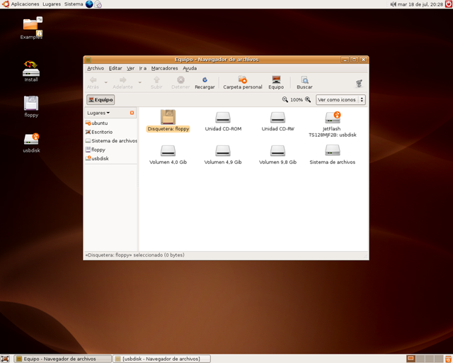 Disquetes. Ponemos el medio en la unidad, vamos al menú Lugares - > Equipo o pulsamos el botón Equipo del administrador de archivos. En esta ventana hacemos una doble pulsación con el botón izquierdo en el icono con el título Disquetera. Aparecerá entonces un icono en el escritorio (de nombre floppy) y se nos mostrarán los contenidos del disquete.