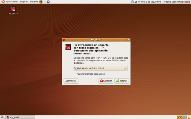 Lectores de tarjetas. Algunos equipos cuentan con un lector de tarjetas (que puede ser de los tipos SD, MMC, MS, MS-Pro, mini SD, MS-Duo, MS-Pro, lo que se conoce en el argot como 8 en 1). Introduzca la tarjeta en el lector, verá entonces una ventana emergente que le pregunta qué hacer al tiempo que aparece en el escritorio un icono que la representa. Puede trabajar ahora con la tarjeta del mismo modo que lo haría con un llavero de memoria USB.