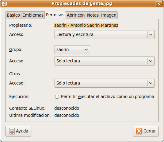 El propietario es saorin, y el grupo para el que se asignan los permisos es saorin. Vemos entonces que el propietario tiene permisos de lectura y escritura; el grupo y el resto de usuarios únicamente de lectura. Ahora que comprende cómo están asignados los permisos veámos qué significan: