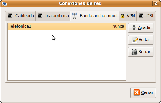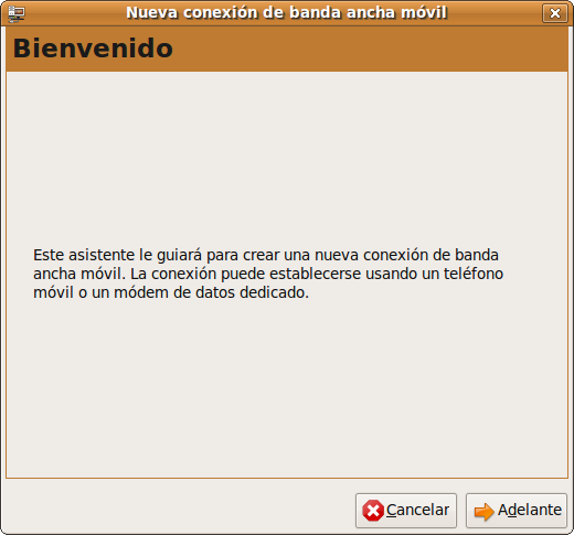 Una vez en el escritorio de Ubuntu conecte el dispositivo USB a su equipo. Se iniciará entonces el asistente de conexión. Pulse Adelante. Si el asistente no se ejecuta o bien lo cerró inadvertidamente puede iniciarlo manualmente. Para esto haga clic con el botón derecho del ratón en el icono NetworkManager y en el menú emergente seleccione Editar las conexiones... Pulse luego en la pestaña Banda ancha móvil y finalmente haga clic en el botón Añadir.