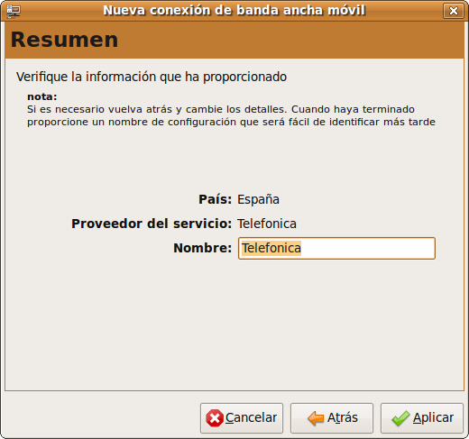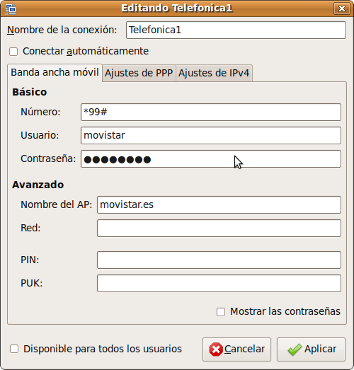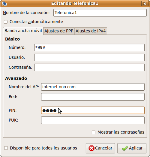 Lo único que debe hacer entonces es modificarlos para ajustarlos a los que su proveedor le haya proporcionado. El campo PIN es opcional. Si no lo pone aquí se le pedirá más adelante cuando trate de hacer la conexión. Finalmente pulse Aplicar.