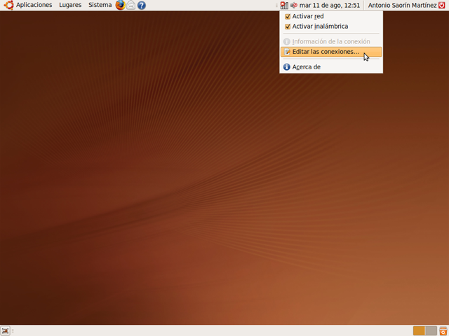 Puede ocurrir como ya hemos anticipado que el nombre de su proveedor de servicios no estuviese en la lista (si ya lo estaba pase al siguiente apartado). En ese caso ahora es el momento de hacer las modificaciones oportunas. Para ello haga clic con el botón derecho del ratón en el icono NetworkManager y en el menú emergente seleccione Editar las conexiones...
