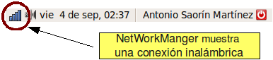 Network Manager es un pequeño icono en el área de notificación del sistema en la parte superior derecha de la pantalla. Tendrá la forma de dos ordenadores superpuestos cuando la conexión sea cableada o cuatro barras escalonadas, grises o azules, cuando se trate de una conexión inalámbrica. Haga clic con el botón izquierdo del ratón sobre ese icono para acceder a las funciones automáticas, tales como conectarse a una red, o con el botón derecho para el control manual y activar o desactivar las conexiones.