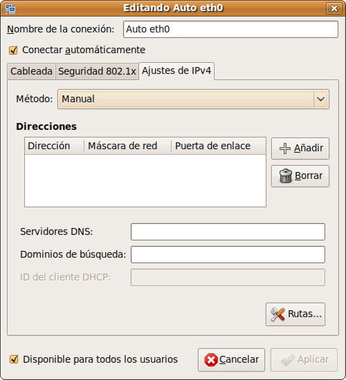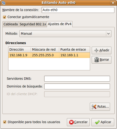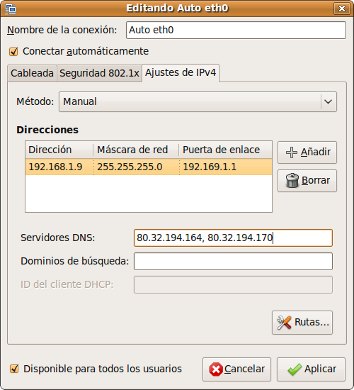 Nos falta por configurar los DNS, (servidores de nombre de dominio) para que sea posible convertir las direcciones a las que estamos acostumbrados, por ejemplo www.ubuntu.com en direcciones numéricas. Consulte al administrador de su red o a su proveedor de acceso a Internet para obtener tales direcciones. Haga clic en Eel campo Servidores DNS y escriba la dirección de su servidor DNS. Si utiliza más de uno utilice comas para separarlos. Por ejemplo 80.32.194.164, 80.32.194.170