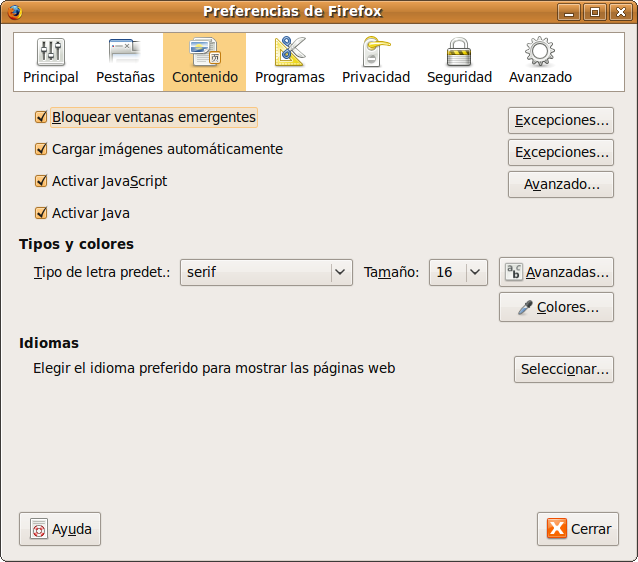La primera de las opciones nos permite Bloquear ventanas emergentes marcando la casilla de verificación situada a su izquierda. En cualquier caso, es la opción predeterminada en Firefox.
