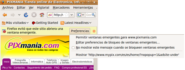 No obstante, cuando un sitio web intenta abrir una ventana emergente, un mensaje en la parte superior de la pantalla nos avisa de esta circunstancia y, pulsando sobre el botón Preferencias podemos configurar el comportamiento de Firefox ante las ventanas emergentes procedentes de ese sitio web en particular o en general.