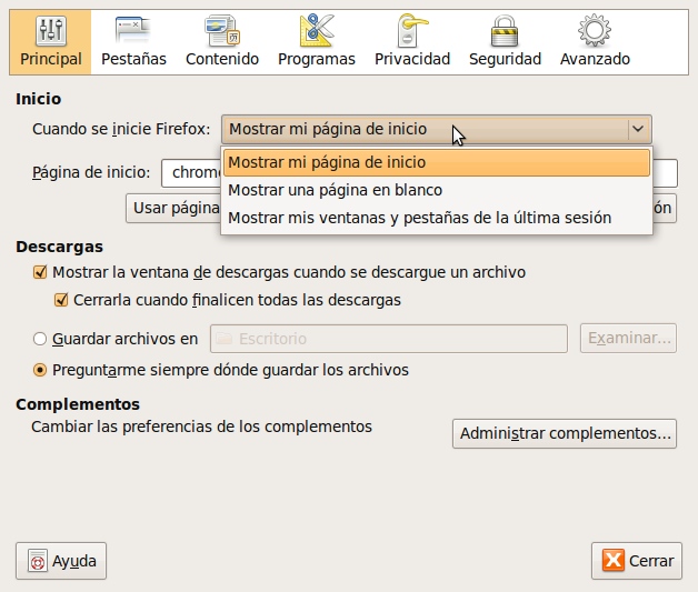 - Mostrar mis ventanas y pestañas de la última sesión. Estas dos últimas opciones son suficientemente descriptivas.