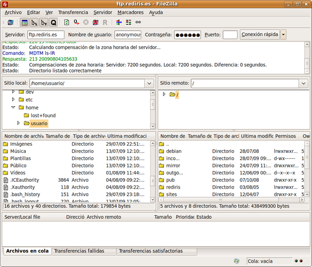 Filezilla es también un cliente de FTP muy popular entre los usuarios de otros sistemas operativos. En esencia el comportamiento es similar a gFTP con la posibilidad de acceder a servidores públicos o autentificados.