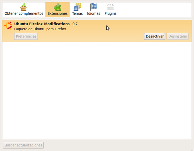 Si pulsamos sobre Obtener extensiones de Ubuntu, se nos abrirá un instalador propio para incluir extensiones auspiciadas por la distribución. En este caso la ventana está dividida en dos zonas, en la primera se listan todas las extensiones filtradas mediante el criterio establecido en Mostrar o según el término introducido en la caja de búsqueda y en la parte inferior una descripción, generalmente en inglés, de la extensión seleccionada. En cualquier caso, la instalación es prácticamente automática. A modo de ejemplo, trataremos de mostrar la instalación de una extensión que nos avisa de la existencia de mensajes nuevos en una cuenta de correo web, si tenemos alguna de este tipo.