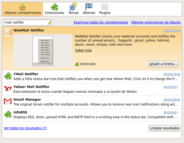 Utilizaremos la caja de búsqueda de la ventana de complementos en la que escribiremos mail notifier. Entonces se nos mostrará una lista de extensiones que tienen algo que ver con la notificación de correo, el primero de ellos, WebMail Notifier, es el que nos interesa.