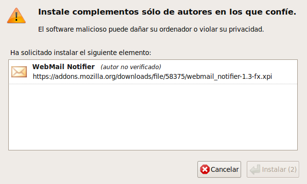 Pulsamos sobre Añadir a Firefox y un mensaje de advertencia nos recuerda que debemos instalar complementos procedentes de autores de confianza. En este caso, continuamos con tranquilidad pues el complemento procede del proyecto Mozilla.