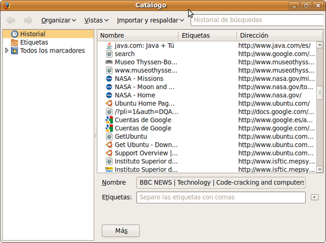 Para consultar alguna de las páginas que visitó en sesiones anteriores, abra el menú Historial y seleccione Mostrar todo el historial. También puede hacerlo con la combinación de teclas Ctrl + Mayúsc. + H. Obtendrá una ventana llamada Catálogo. En el panel lateral aparecerá una lista de entradas del histórico, junto a sus marcadores. Haga clic en cualquiera de ellas o pulse la flecha situada a la izquierda para desplegar las subentradas. En la parte central obtendrá la lista de páginas correspondiente. Para ir a una página concreta pulse en el enlace. Cuando quiera cerrar el historial use el menú Organizar -> Cerrar o bien utilice el botón en forma de aspa en la parte superior derecha de la ventana.