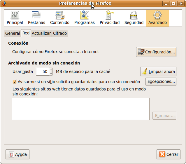 - Para borrar los contenidos almacenados en la caché haga clic en Limpiar ahora.