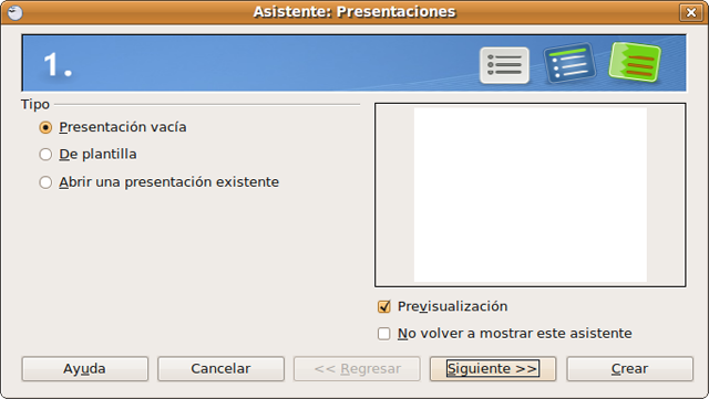 Desde cualquier componente de OpenOffice.org podemos acceder al menú Archivo -> Nuevo -> Presentación o bien desde Aplicaciones -> Oficina -> OpenOffice.org Presentaciones. Se iniciará entonces un asistente que nos guiará en el proceso de diseño de las diapositivas.