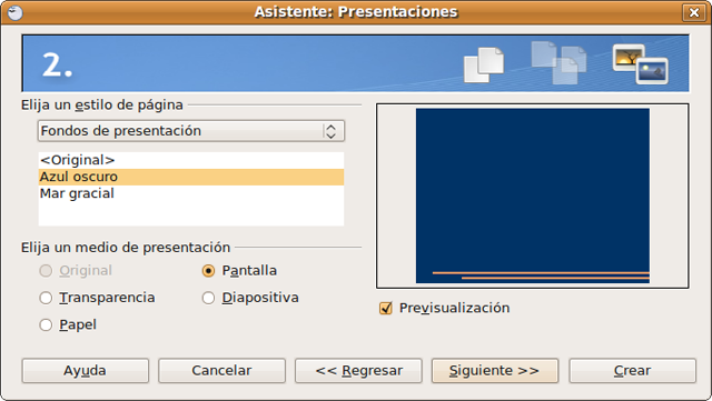Si decidimos utilizar el asistente, estableceremos el fondo y el medio de la diapositiva ayudados por la previsualización que se muestra en la parte derecha de la pantalla. O bien basaremos nuestra presentación en una de las plantillas existentes.