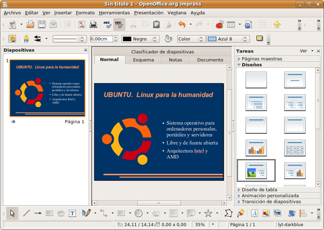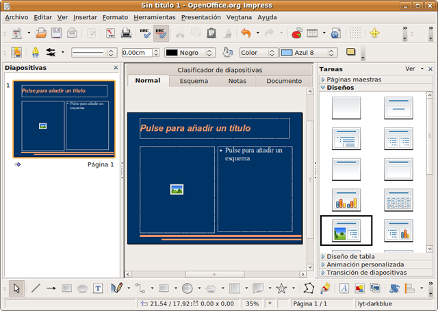 Finalmente pulsamos el botón Crear y nos encontramos ante la ventana principal de la aplicación. Lo primero que haremos será elegir la estructura de la diapositiva seleccionándola de entre las que figuran en la columna Diseños ubicada a la derecha de la pantalla.