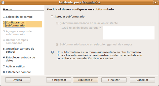 Configurar un subformulario. Un subformulario es un formulario que se inserta en otro formulario. Esta pantalla nos permitirá decidir si queremos utilizar un subformulario y configurar sus propiedades. Si no queremos un subformulario pasaremos directamente al paso siguiente.