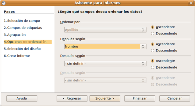 Opciones de ordenación. Seleccione el orden en que se deben mostrar los campos en el informe.