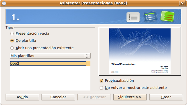 Para hacer uso de su nueva plantilla con el Asistente, marque la opción De plantilla y seleccione Mis plantillas en la lista desplegable, o bien mediante el menú Archivo -> Nuevo -> Plantillas y documentos.