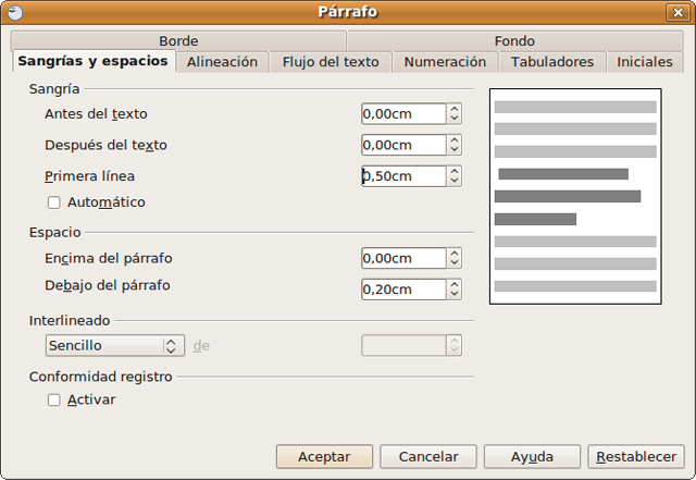 Vaya al menú Formato -> Párrafo y pulse la pestaña Sangrías y espacios.
