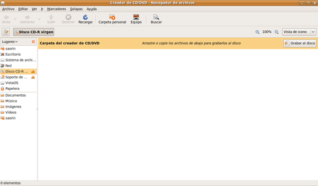 Cuando inserte un CD virgen en la grabadora, Ubuntu le preguntará si desea grabarlo utilizando la aplicación Creador de CD/DVD.