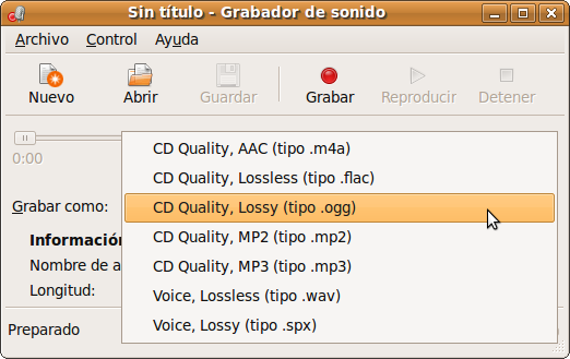 Puede grabar sonidos si tiene conectado a su equipo un micrófono o cualquier otro dispositivo de grabación. Ubuntu viene con una aplicación simple de grabación de sonido, para ejecutarla vaya al menú Aplicaciones → Sonido y Vídeo → Grabador de sonido