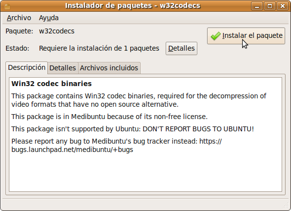 El siguiente paso es por tanto obtener e instalar esos codecs. Los podemos encontrar en la página http://packages.medibuntu.org/. Una vez allí pulsamos en el enlace correspondiente a nuestra distribución de Ubuntu (en el caso de la 9.04 es jaunty). Después seguimos el enlace w32codecs. Llegamos así a la página de descarga. En ella hacemos clic en i386. Si trabaja con Ubuntu 9.04 puede seguir este enlace para una descarga directa: