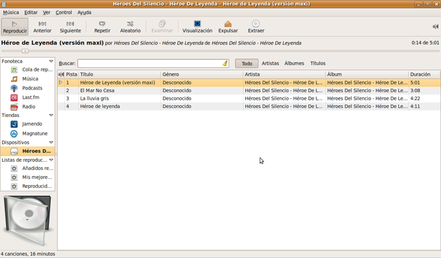 Si desea reproducir un fichero de música mp3 u ogg haga doble clic sobre él. En ese caso se ejecutará el reproductor de películas. Si quiere que se abra con Rhythmbox haga clic sobre él con el botón derecho del ratón y en el menú emergente seleccione Abrir con reproductor de música Rhythmbox. Rhythmbox tratará de obtener desde Internet información sobre el título, género, artista y álbum así como una imagen de la carátula.