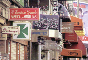 La forma: La forma puede ser agradable en sí misma o producir efectos interesantes por repetición, contraste, superposición, por una sensación de volumen conseguida mediante la gradación de sus tonos, o simplemente por su silueta. En la fotografía de la derecha el motivo de interés es la agobiante superposición de letreros publicitarios. |