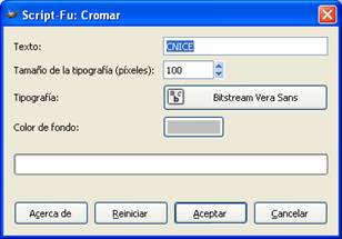 En esta ventana se configuran algunas opciones del logotipo, en el apartado Texto introducimos el texto en este caso la palabra CNICE, el Tamaño de la Tipografía: 100, si pulsamos sobre el botón Tipografía aparece una nueva ventana en la que seleccionaremos el tipo de letra para el texto, en este caso vamos elegir Bitstream Vera Sans