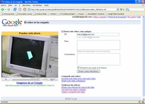 Que rellenaremos, tal como está en la pantalla anterior, admite vídeos de un máximo de 100 Mb en los formatos más habituales: AVI, MPEG, Quicktime, Real y Windows Media.