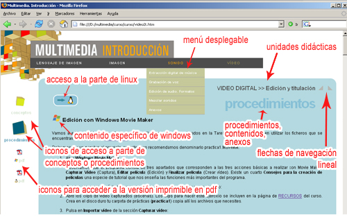 Las diferentes unidades didácticas tienen una estructura general que se muestra en la siguiente pantalla: