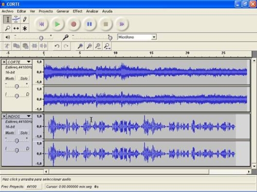 Con este ejercicio se pretende superponer una voz manteniendo una música de fondo, para ello vamos a utilizar los ficheros CORTE.WAV e INDIOS.WAV vistos anteriormente.