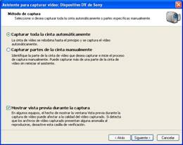 pulsando en Siguiente, nos aparece una nueva ventana, en ella podremos elegir entre Capturar toda la cinta automáticamente o sólo partes manualmente, esto dependerá fundamentalmente de lo que hayamos grabado. Lo que sí es conveniente es activar la casilla Mostrar vista previa durante la captura: