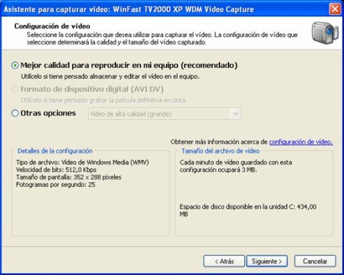 Pulsando el botón Siguiente pasamos a otra ventana que, al igual que en la captura digital nos pide el nombre del archivo y la carpeta en donde queremos guardarlo, aparece otra ventana en la que recomendamos los valores que aparecen por defecto: Mejor calidad para reproducir en mi equipo.