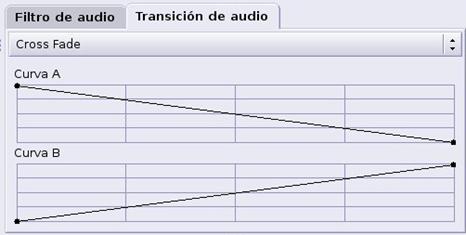 Cuando utilices "Cross Fade" (fundido cruzado) tienes, en la ventana, la posibilidad de determinar el nivel de sonido de salida de la escena (Curva A) y el nivel de entrada (Curva B) del sonido de la siguiente escena, basta con hacer clic con el ratón en los puntos de los extremos de la línea y arrastrarlos a la posición deseada. Pulsa el botón