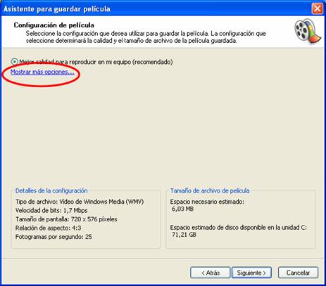 Se sugiere probar el resto de las opciones y añadiremos que, como regla general, a mayor tamaño del fichero, mayor calidad del vídeo. El fichero obtenido tendrá extensión WMV, propia de Microsoft.