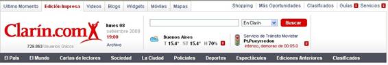 En la siguiente captura de pantalla (8 de septiembre de 2008), la cabecera se mantiene en la mayoría de las páginas que sirve Clarín e incluye tres bloques separados por una fina línea vertical: