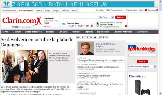 La página inicial (pestaña “Último momento”) acumula un gran número de contenidos, lo que hace necesario que utilicemos el scroll para bajar y seguir descubriendo el resto, que ocupa (en el ejemplo mostrado de 7/9/08) más de una quincena de pantallas (de ahí que nos detengamos sólo en el análisis de la primera pantalla).